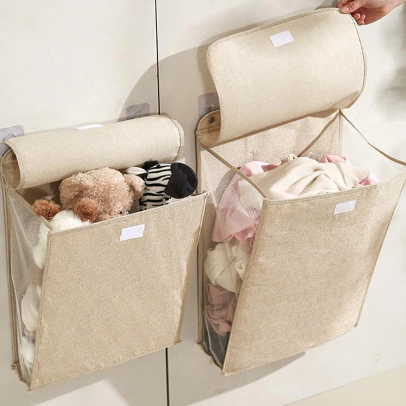 Foldable Adhesive Laundry Basket Hamper, Multifunctional Punch Free Wall Hanging Washing Clothes Mesh Hook Organizer